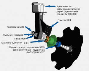 Борона містить два ряди дисків, кожен з яких розташований на індивідуальній стійці, яка кріпиться до бруса двома Г-подібними скобами (діаметр 20 мм.). Дана конструкція виключаЄ забивання міждискового простору. Борона може експлуатуватися в усіх грунтово-кліматичних зонах де вологість рунту не перевищую 27 відсотків і з твердістю грунту не більше 3,5 Мпа, а так само не рекомендуЄться експлуатація даної борони в районах із значними кам'янистими включеннями. За рахунок використання в конструкції індивідуальних стійок фронтальна борона може використовуватися на високих робочих швидкостях - до 14 км / год.