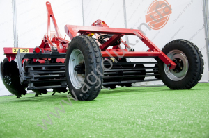 Борони дискові 2.4-20-03-ГІБРИД (модифікація гайка, підшипник 7508 / 7607) - дворядні з діаметром диска 650мм призначені для використання з тракторами від 80 к.с в грунтокліматичних умовах по всій території України, а також на полях з великою кількістю поживних залишків. Кожен диск борони встановлений на індивідуальній суцільнолитій стійці, що дозволяє бороні працювати на полях з великою кількістю рослинних залишків і бур'янів, виключаючи намотування рослинних залишків на вісь диска і забивання міждискового простору, а також забезпечує високу технологічність агрегату. Конструкція агрегату забезпечує плавне регулювання кута атаки кожного ряду дисків в межах від 0 ° до 30 °, що дозволяє оптимально налаштувати борону для різних умов використання.