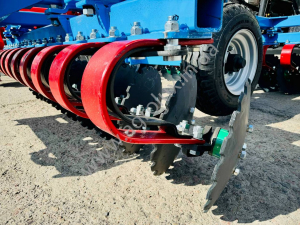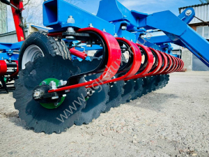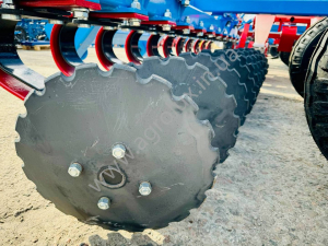 Основні переваги: • Диск Ø 470 мм — забезпечує достатню масу та інерцію для проникнення у ґрунт, навіть якщо він не оброблявся чи має більшу щільність. • Причіпна конструкція — дозволяє легко переміщати, транспортувати та агрегувати з тракторами середньої потужності. • Регульована глибина обробки — можливість налаштування глибини від ~5 до ~12-15 см, залежно від умов ґрунту чи технології вирощування культур. • Кут атаки дисків — оптимально підібраний для ефективного різання та змішування шару ґрунту, зменшення зносу та енерговитрат. • Надійні компоненти — високоякісні підшипники, стійки, диски (товщина та матеріал), що витримують інтенсивну експлуатацію та мінімізують обслуговування. • Економія пального та часу — більша швидкість роботи (залежно від трактора) та менші витрати на паливо/обслуговування порівняно з комбінацією плуг + культиватор.
